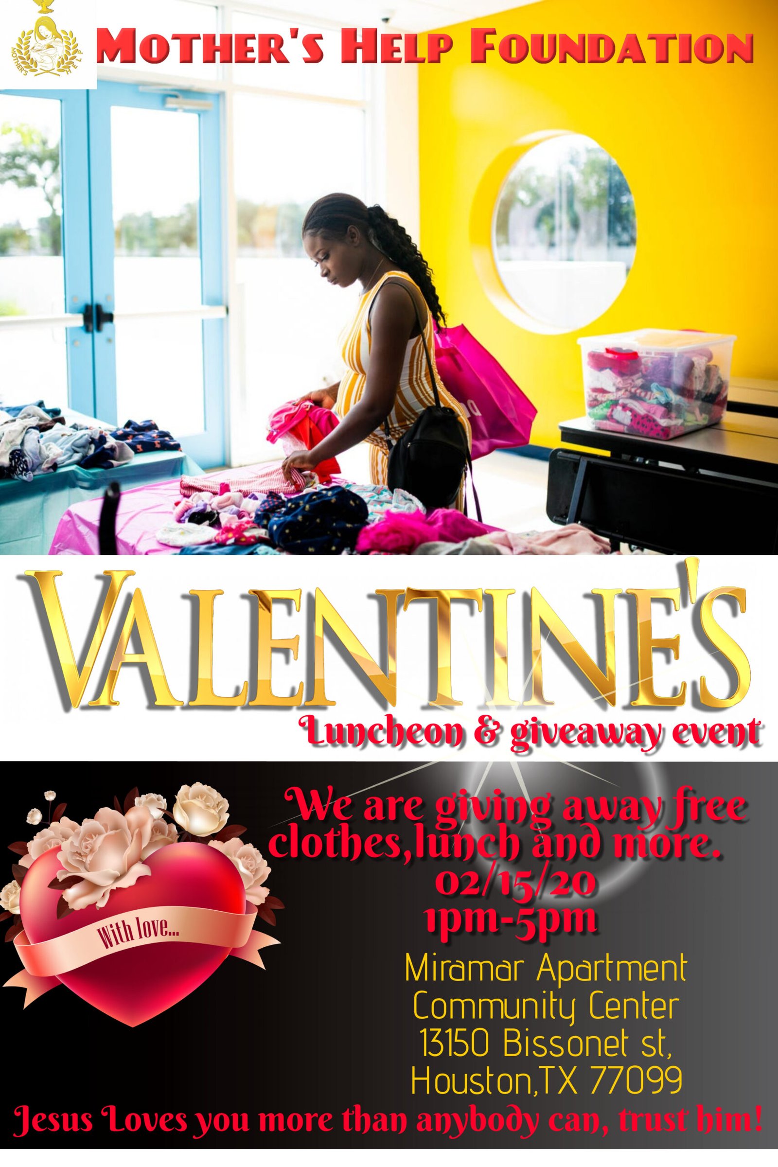 On 2/15/2020, Mothers Help Foundation organized a luncheon and giveaway event where we shared a free meal and did an open concept donation of clothes and shoes at Miramar apartments in Houston, Texas.